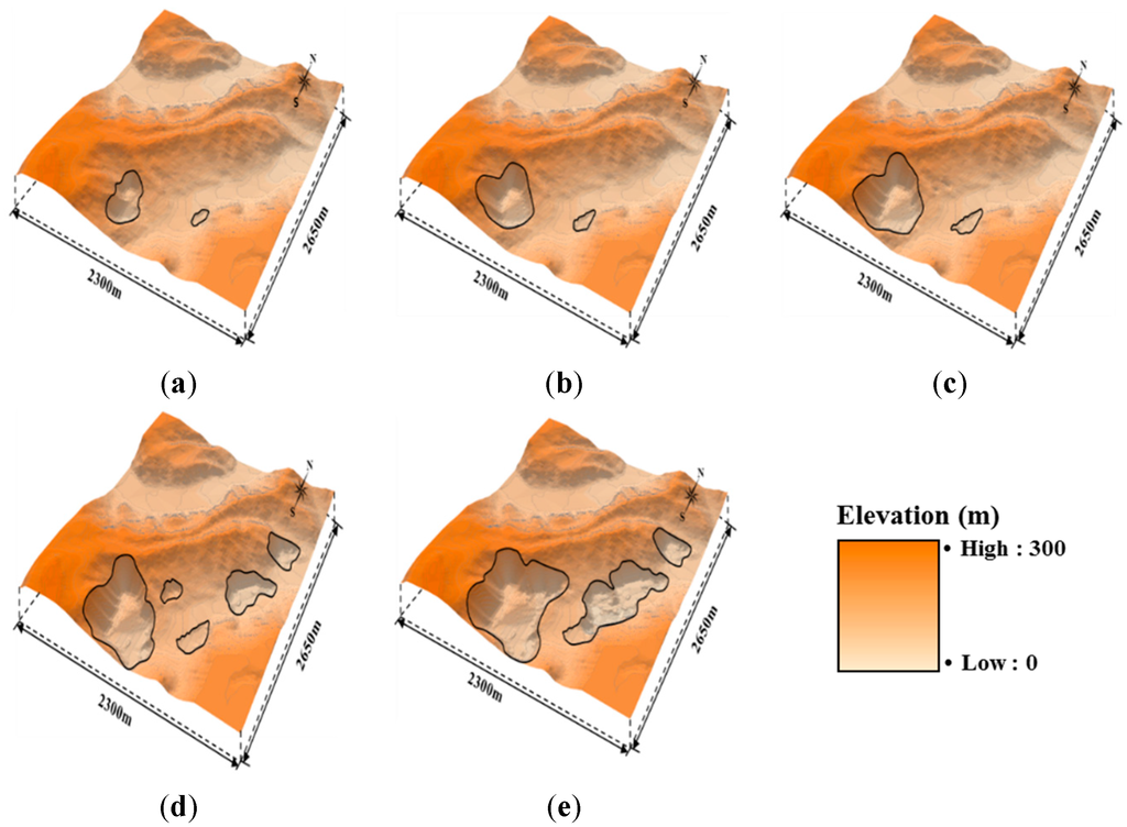 Pit optimization results using the floating cone algorithm. (a) Result No. 34 (Revenue Factor (RF) of Cu = 0.86, RF of Zn = 0.79); (b) Result No. 25 (RF of Cu = 1.01, RF of Zn = 1.00); (c) Result No. 55 (RF of Cu = 1.17, RF of Zn = 0.91); (d) Result No. 11 (RF of Cu = 1.34, RF of Zn = 1.58); (e) Result No. 21 (RF of Cu = 1.57, RF of Zn = 1.14).