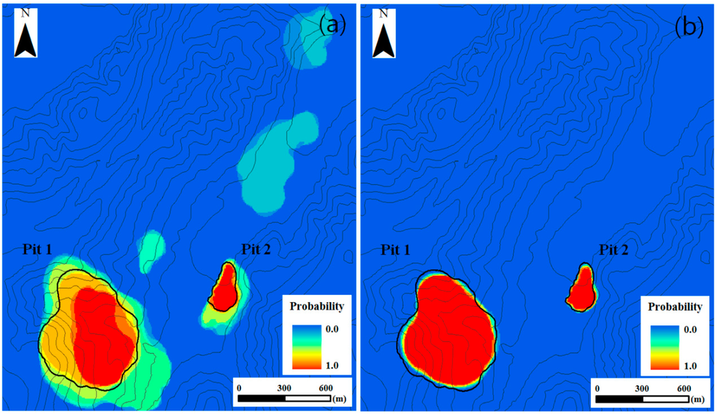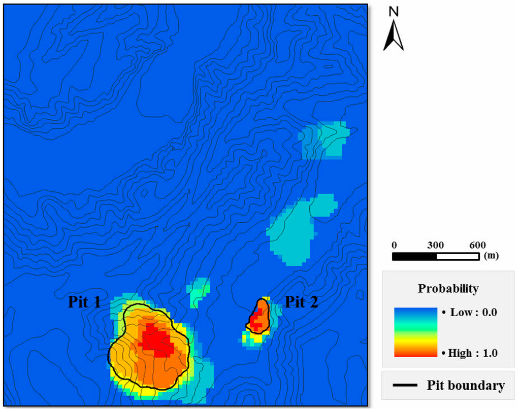 On the other hand, if copper and zinc prices increase from the current reference prices, it is possible that the optimal open pit boundary further expands from the solid black line, and Figure 9 shows the probabilities that the blocks are located within the open pit boundary. East of the study area, there is a possibility that an additional open pit can be formed if mineral prices increase; however, the probability is not high, at 20%.