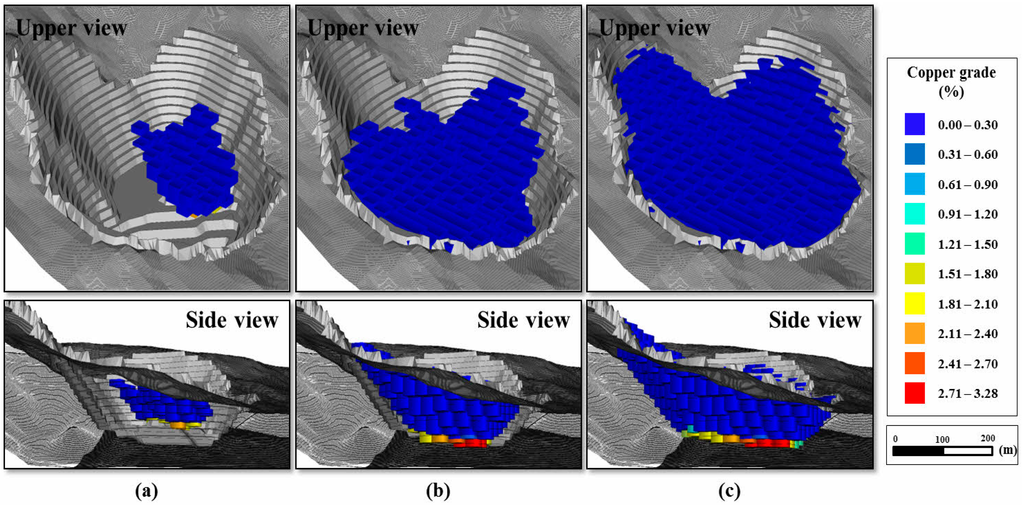 Figure 10 is a visual representation of the blocks that will be distributed within the open pit optimal boundary despite the variation in copper and zinc prices, using the probability model formation results. The results of graphic representation of the blocks to be distributed within the optimal boundary by applying three confidence levels (90% or higher, 80% or higher, and 70% or higher) showed that setting confidence level higher resulted in a smaller size of open pit, and setting confidence level lower resulted in a larger size of open pit.