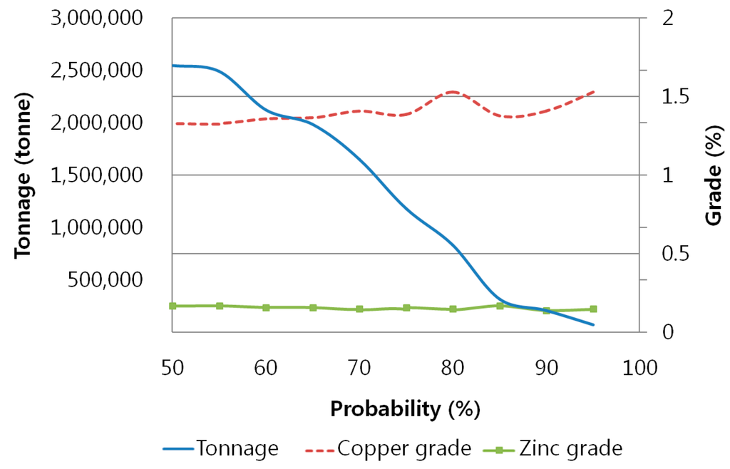 After extracting the blocks to be distributed within the optimal boundary of the study area by applying various confidence levels, the ore reserve was estimated based on the extracted blocks, and the results are shown in Figure 11. It was found that when confidence level was set at 90% or higher, ore reserve was about 76,000 tonnes, the grade of copper was 1.53%, and the grade of zinc was 0.15%. On the other hand, when confidence level was set at 50%, ore reserve was about 2,550,000 tonnes, the grade of copper was 1.33%, and the grade of zinc was 0.15%. These indicate that when setting confidence level higher when extracting blocks within optimal boundary in the probability model, ore reserve estimates decrease. The mean grade of the blocks within optimal boundary varied somewhat depending on the confidence level of the probability model but did not show any particular pattern.