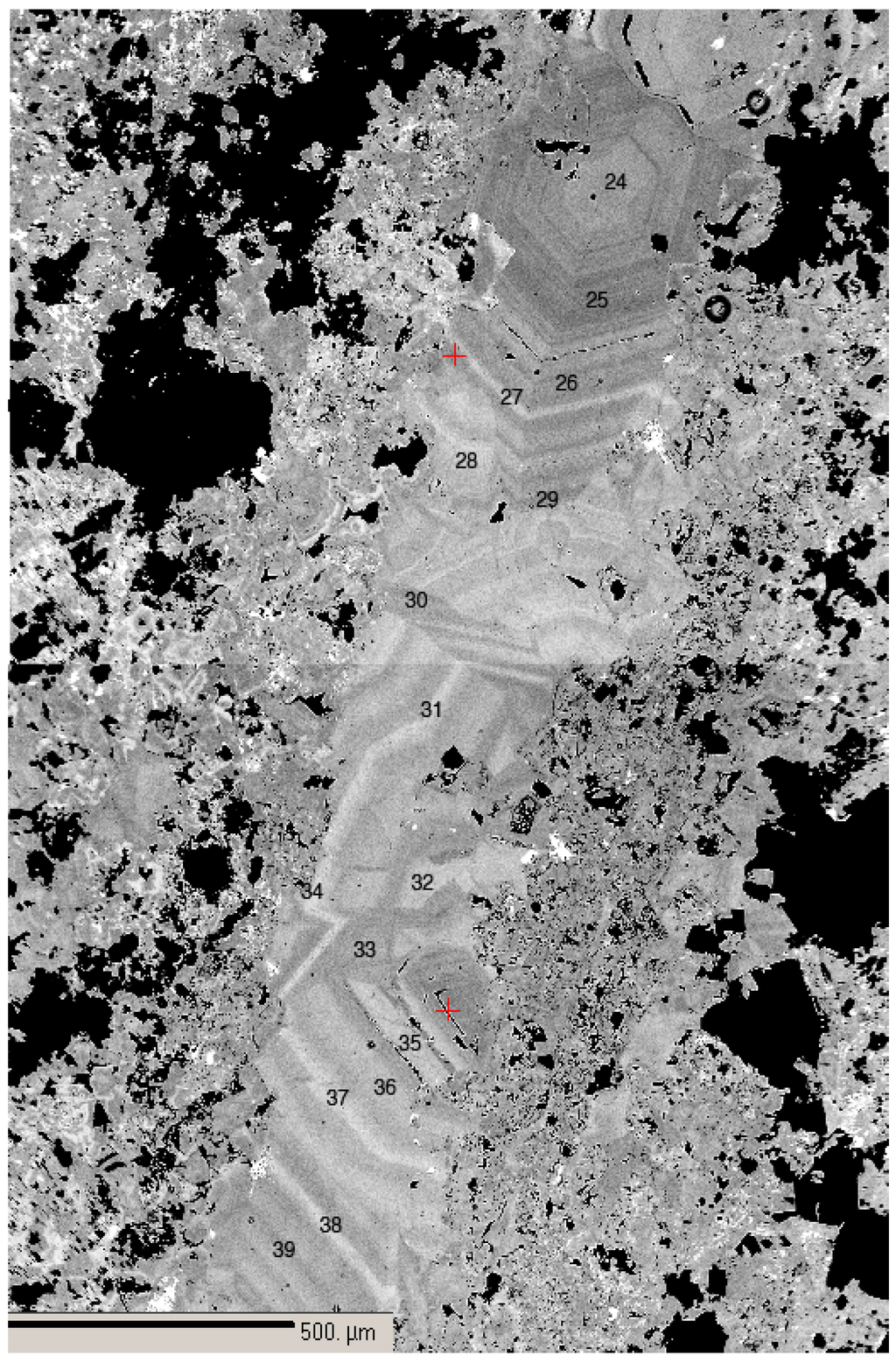 Backscattered scanning electron micrograph of zoned willemite, sample TM06-15. Numbers represent analyses, reported in Table S1.