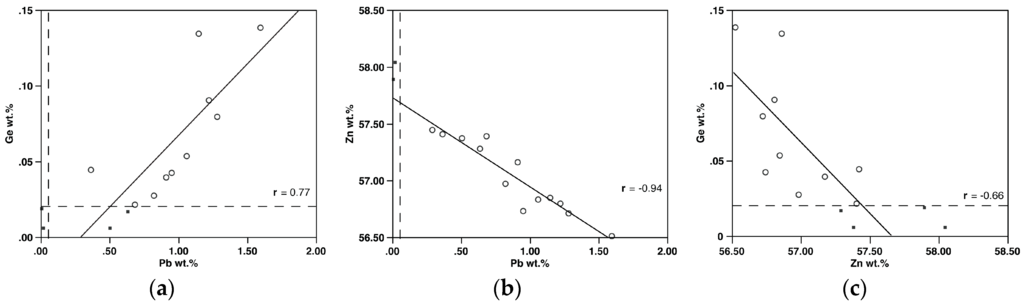 - Pb and Ge are positively correlated (r = 0.77). The Pb and Ge concentrations range from below the detection limits to over 1.5 wt % and 1400 ppm, respectively. Concentrations of both elements increase from core to rim, overprinting tandem oscillations between extreme values.