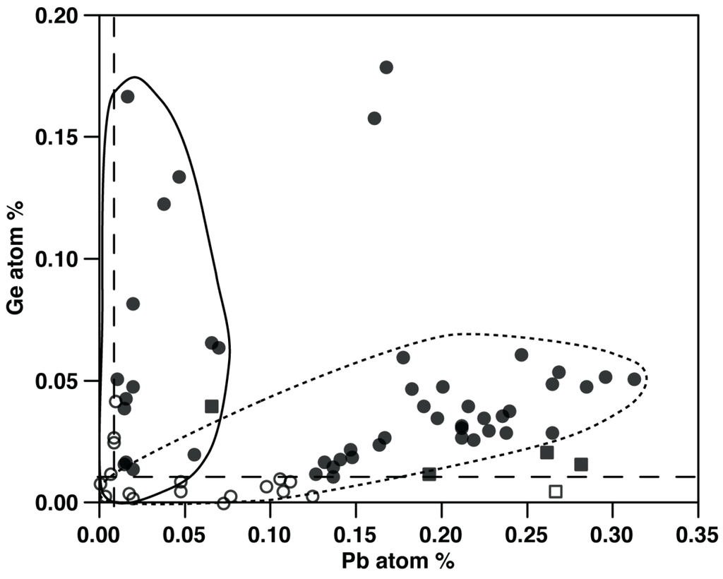 Pb vs. Ge (atom %) in willemite. Circles: TM06-15; squares: TM06-18. Dotted line outlines low Ge-high Pb trend, while solid line outlines the high Ge-low Pb trend. Open symbols are below detection limits, which are indicated by dashed lines.