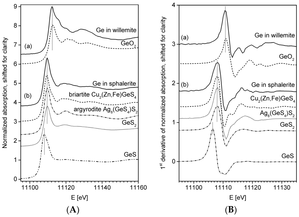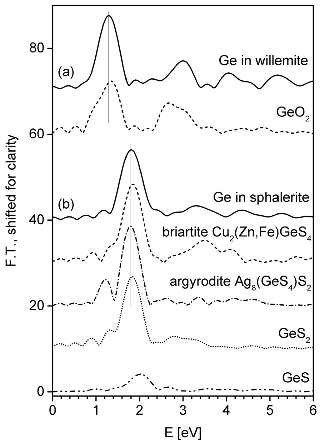 The positions of the white line and of the maximum of the first derivative of the Ge K XANES spectrum of the willemite is very close to the one of a GeO2 reference spectrum, whereas the positions of Ge in sulfidic environment are located at about 2.7 eV lower energies (Figure 8).