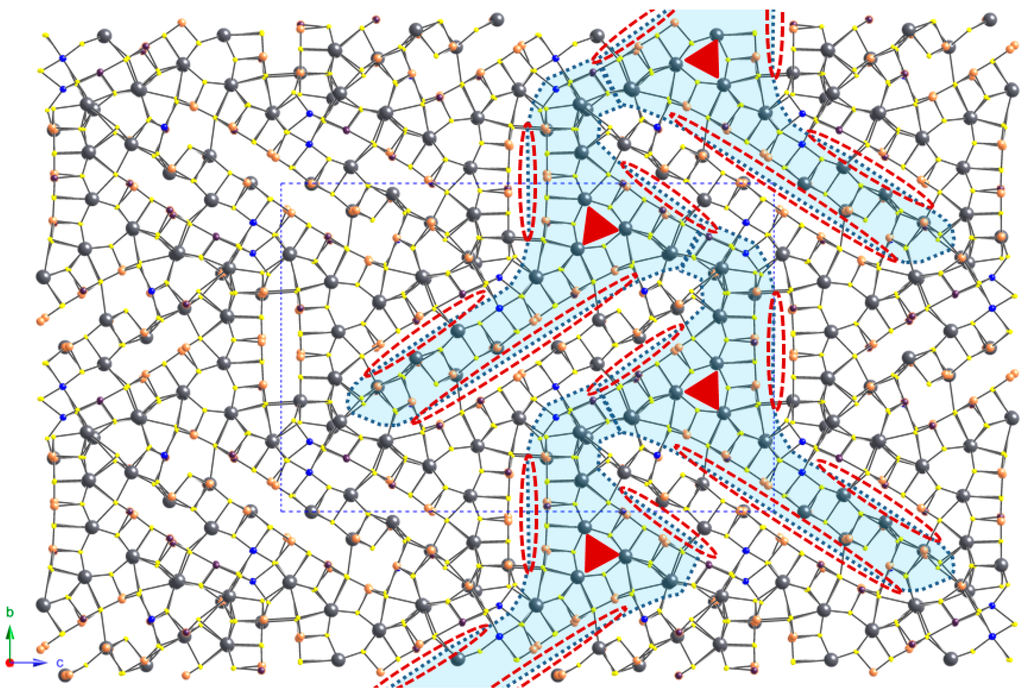 Projection of the crystal structure of ciriottiite, as seen down a. The fishbone layer along b, formed by the connection of complex columns, is shaded in light blue. Red ellipses (dotted lines) symbolize the lone-electron-pair micelles of (Sb/As) atoms. Red triangles show the pseudotrigonal organization of the prismatic core of the complex columns. Circles: grey = Pb sites; orange = Sb sites; violet = As sites; blue = Cu sites; yellow = S sites.