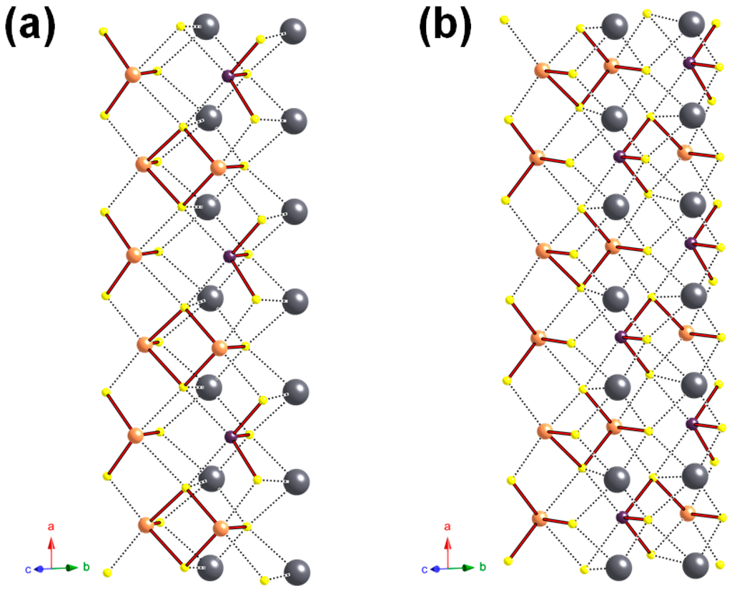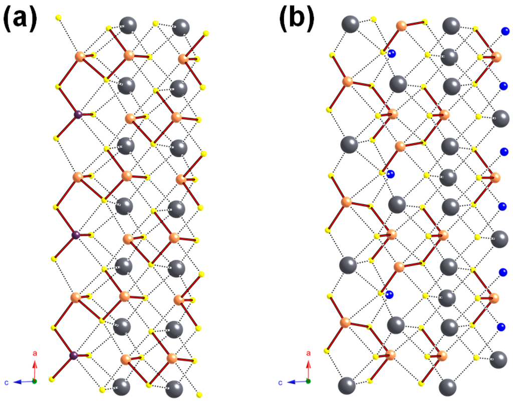 - Makovicky, E. Cyclically twinned sulphosalt structures and their approximate analogues. Z. Kristallogr. 1985, 173, 1–23. [Google Scholar] [CrossRef]