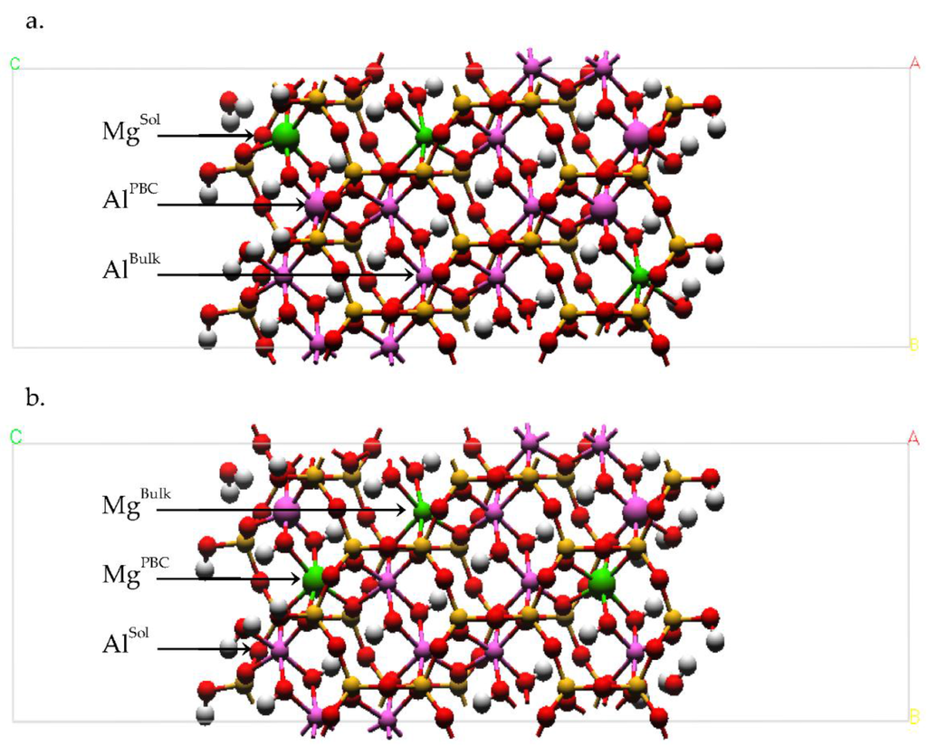 In our MD simulations, the coordination number of the MgSol and MgPBC were 5.72 and 5.99—similar to the results of AlSol and AlPBC. The reduced coordination of the MgSol is attributed to the low water adsorption energy, Hads, (−57 kJ/mol). When we calculated the Hads for the solvent accessible Al sites using DFT, it was equivalent to that of the Mg sites (−57 kJ/mol). Thus, physisorbed water molecules associated with the solvent accessible octahedral sites of the AC edge are likely to be exchanged [,], regardless of whether the octahedral cation is Al or Mg.