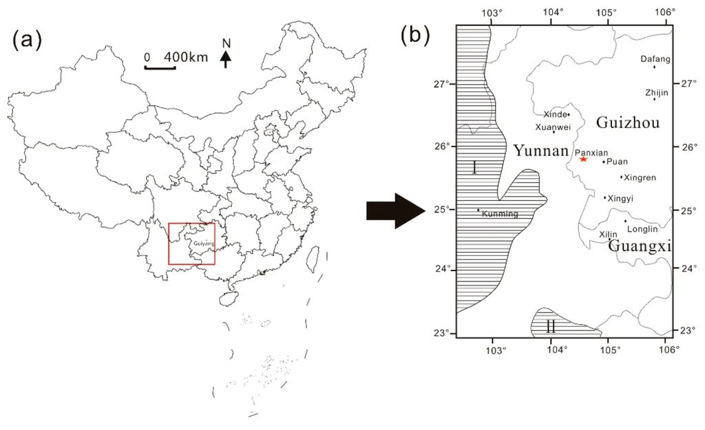 Location of the Yueliangtian coal mine. (a) China map and the location of study area; (b) Depositional environments during the Late Permian in Guizhou province, China. I, Kangdian Upland. II, Northern Vietnam Upland. (b) The enlargement of the red area in (a), modified from Dai et al. [15].