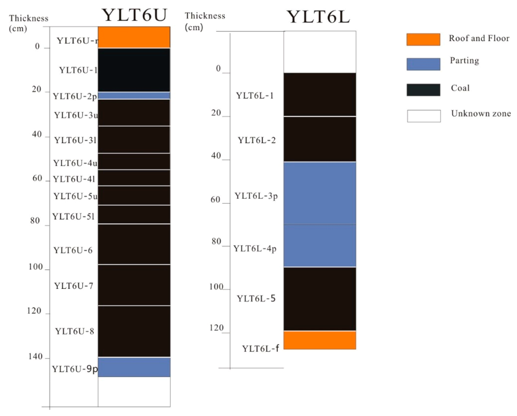 According to Chinese Standard Method GB/T 482-2008 [16], a total of nineteen bench samples were collected from the No. 6 coal seam (YLT6) in the underground workings of the Yueliangtian coal mine in Panxian county, western Guizhou. The floor of the YLT6U coal and the roof of the YLT6L coal are unavailable, due to the complex structure, as well as limited capacity in sample collection. From top to bottom, the roof strata (with suffix-r), coal benches, partings (with suffix-p) and floor-stratum samples (with suffix-f) are identified, with the coal seams numbered in increasing order from top to bottom (Figure 3). Each bench sample was immediately stored in a clean and uncontaminated plastic bag, to ensure as little contamination and oxidation as possible. The thickness of each sample is given in Table 1.