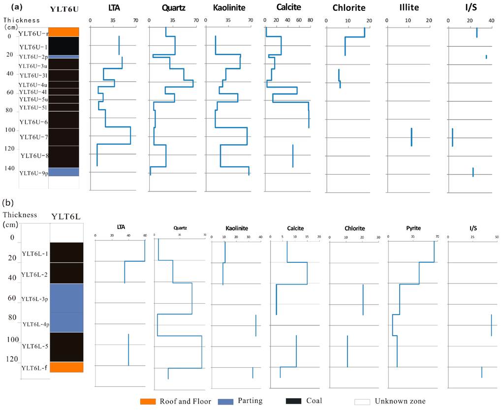 Concentration (%) variations of minerals and coal LTAs (%) through the No. 6 coal seam sections in the Yueliangtian coal mine. (a) YLT6U coal; (b) YLT6L coal.