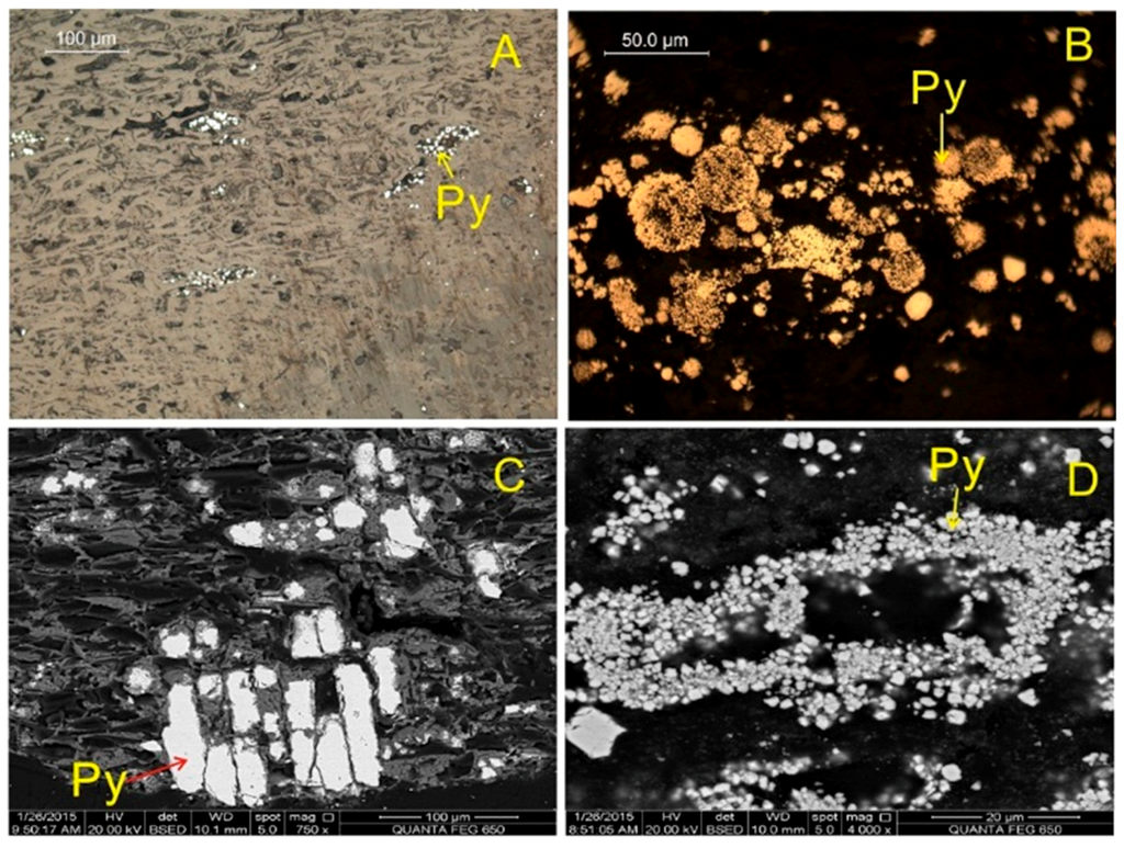 Kaolinite in the YLT6 coal has two modes of occurrence: as cell fillings (Figure 7A,B) and as detrital particles (Figure 5D). The former is of authigenic origin, and the latter is probably of terrigenous origin. In contrast to the minerals described above, pyrite is distributed completely differently between the YLT6U and YLT6L coals. Although below the detection limit of the XRD technique, cell-filling pyrite was observed under the optical microscope in sample YLT6U-8 (Figure 8A). Pyrites of framboidal (Figure 8B), cell-fillings (Figure 7A,B and Figure 8C), cubic (Figure 8D) and nodular (Figure 8E) forms occur in the YLT6L coal. It is probably of syngenetic or early diagenetic origin [37,38,39,40,41]. Pyrite also occurs as cleat- and fracture-fillings (Figure 7A and Figure 8C), suggesting an epigenetic origin of hydrothermal solutions with a formation temperature around 150–200 °C [5,41,42]. Fe-S compounds with different levels of brightness (Figure 8F) deserve a special note: the atomic ratios of Fe against S of Spots 1 and 2 (Figure 8G,H) are 1:2.4 and 1:2, respectively, probably suggesting an oxidation product of pyrite in Spot 1.