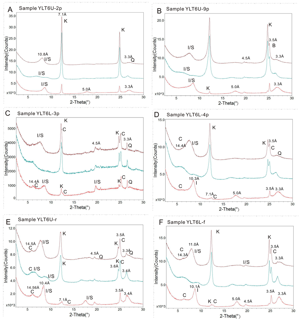 X-ray diffractogram (XRD) patterns of clay-fractions. (A) Sample YLT6U-2p; (B) sample YLT6U-9p; (C) sample YLT6L-3p; (D) sample YLT6L-4p; (E) sample YLT6U-r; (F) sample YLT6L-f. K, kaolinite; I/S, mixed-layer illite/smectite; C, chamosite; B, berthierine; Q, quartz. Natural-oriented (top trace), glycol-saturated (middle trace) and heated (bottom trace). Numbers represent d-spacings in Ångstrom units.