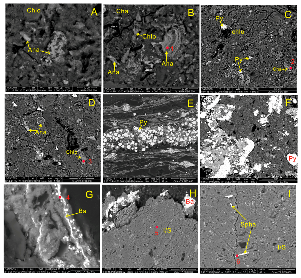 SEM back-scattered electron images in the host rocks (under low vacuum). (A) Quartz, I/S, chamosite and ring-shaped anatase in sample YLT6U-r; (B) Quartz, kaolinite, anatase and chamosite in sample YLT6L-f; (C) Kaolinite and anatase in sample YLT6L-f; (D) Flocculent kaolinite, anatase and chamosite in sample YLT6L-f; (E) Kaolinite and chamosite in sample YLT6L-f; (F) Anatase and pyrite in sample YLT6L-f; (G) Fracture-filling anatase and pyrite in sample YLT6L-f; (H) Anatase, chamosite and apatite in sample YLT6L-f; (I) Euhedral pyrite in sample YLT6L-f. Kao, kaolinite; Py, pyrite; Ana, anatase; Cha, chamosite; Qua, quartz; Apa, apatite.