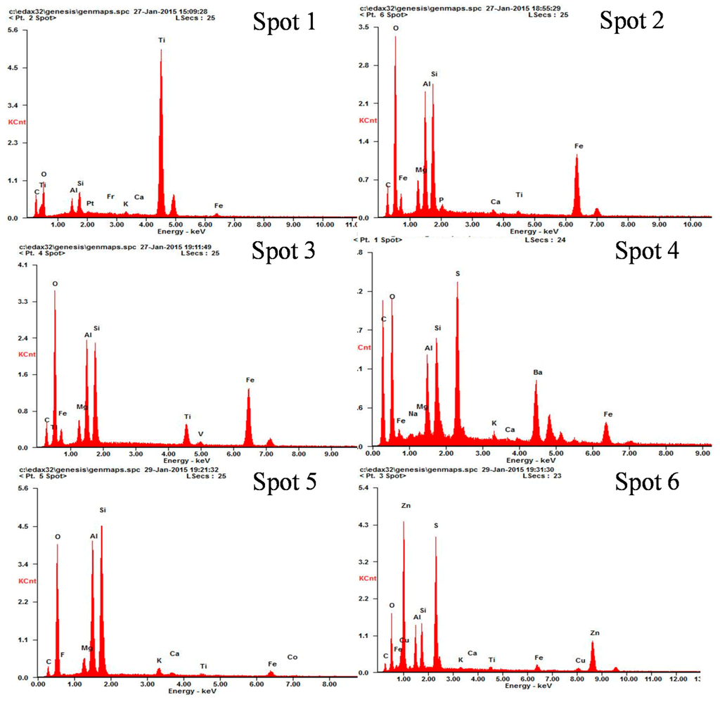 EDS spectra of Spots 1–6 in Figure 11.