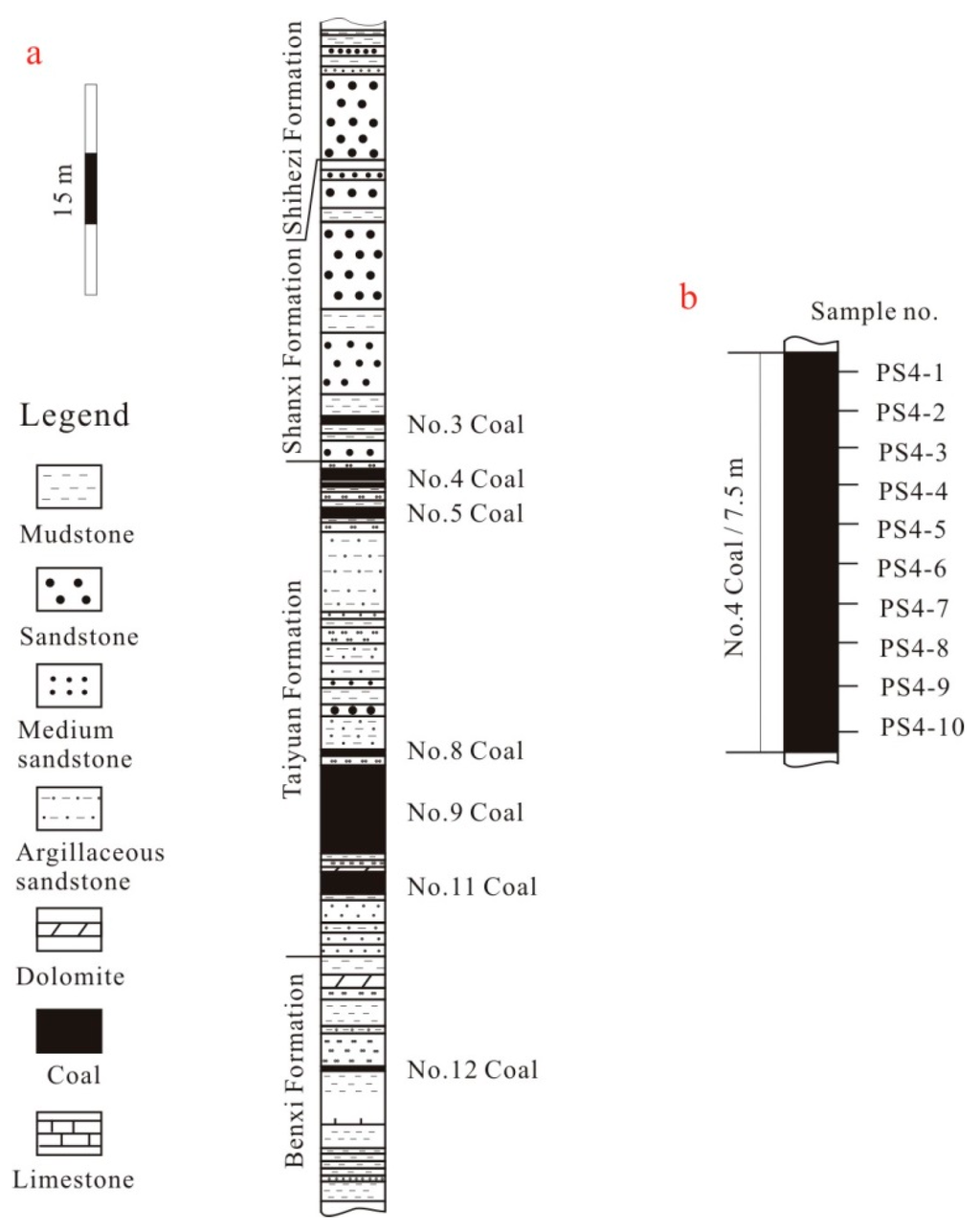 Figure 2. Generalized stratigraphic column: (a) of the Late Pennsylvanian-Permian coal measures in the Ningwu coalfield and sampling profiles; and (b) of the No. 4 Coal in the Pingshuo Coal Mine.