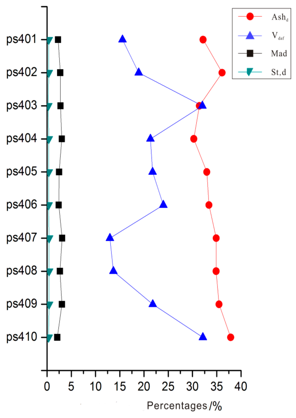 The volatile matter yields of the No. 4 coal vary from 30.27% to 37.88% through the coal-seam section, with a mean of 33.95%, suggesting that the Late Pennsylvanian coals in the Pingshuo coal mine are medium-high volatile bituminous coals based on Chinese Standard MT/T 849-2000 (28.01% to 37.00% for medium-high volatile coal, 37.01% to 50.00% for high volatile coal and >29.00% for super high volatile coal) [24].