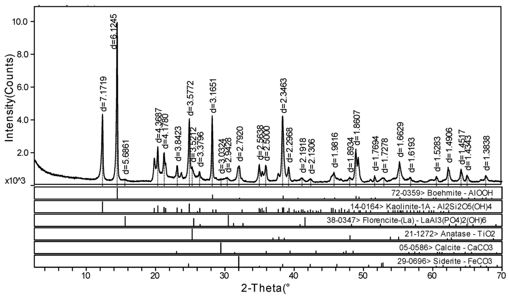 The mineral phase percentages were calculated on a coal ash basis from the XRD results obtained for the low temperature ashes and are reported in Table 2. The results show that minerals in the Pingshuo coals mainly consist of kaolinite, followed by boehmite (averaging 5.09%), siderite (1.35%), anatase (0.29%), goyazite (0.8%), calcite (0.07%), apatite (0.01%) and florencite (0.33%) (Figure 4).
