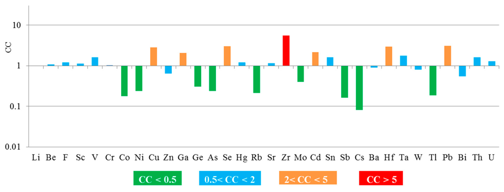 In comparison with Chinese coals [29] or world hard coals [30], Zr (CC = 5.50) is substantially higher in the Pennsylvanian coals from the Pingshuo Mine. Copper (CC = 2.82), Ga (CC = 2.05), Se (CC = 2.99), Cd (CC = 2.14), Hf (CC = 2.97) and Pb (CC = 3.13) are slightly higher than the average values of Chinese coals [29], whereas Li (CC = 0.99), Be (CC = 1.07), F (CC = 1.20), Sc (CC = 1.13), V (CC = 1.61), Cr (CC = 1.00), Zn (CC = 0.64), Hg (CC = 1.20), Sr (CC = 1.16), Sn (CC = 1.60), Ba (CC = 0.89), Ta (CC = 1.75), W (CC = 0.80), Bi (CC = 0.55), Th (CC = 1.63) and U (CC = 1.27) are very close to those of Chinese coals, and the remaining trace elements are lower than the averages of Chinese and world hard coals (CC < 0.5) (CC, concentration coefficient, the ratio of trace element concentration in coal samples investigated vs. averages for Chinese or world hard coals [33]) (Figure 6).