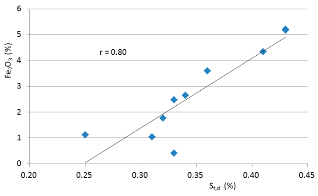 Group 3 includes Fe2O3, MgO, MnO and Sc (Figure 7). Elements in this group have a strong correlation with each other (r > 0.92). Fe2O3 has strong correlations with total sulfur in the coal samples (Figure 8), indicating most of elements in Group 3 probably occur in sulfides in the Pingshuo coals.