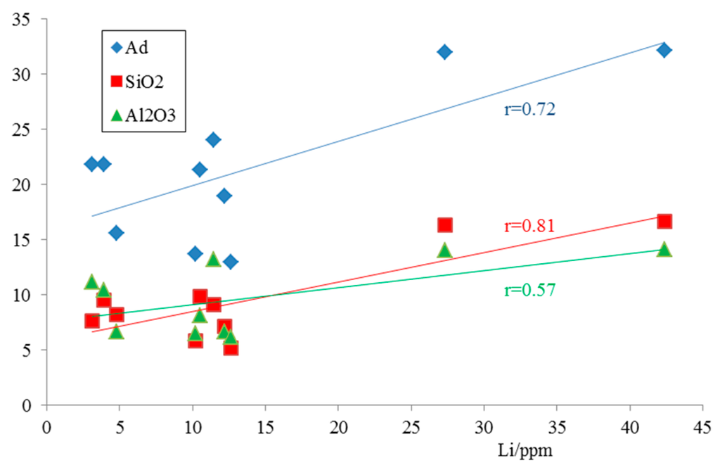 Figure 9. Correlations between Li and ash yield (Ad), SiO2 and Al2O3.