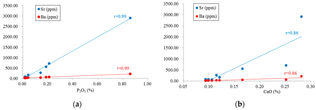 Figure 11. Correlations of Sr and Ba with: P2O5 (a); and CaO (b).