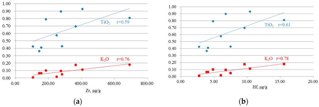 Zircon is the most common zirconium mineral; therefore, Zr is believed to be at least partly due to the probable presence of this heavy mineral in these samples [5]. The fine Zr-phases (<0.5 μm), probably zircon, were detected in anatase [39,51]. Zr and Hf have strong positive correlations with TiO2 and K2O (Figure 13), indicating that some of Zr and Hf may occur in zircons included in the anatase.