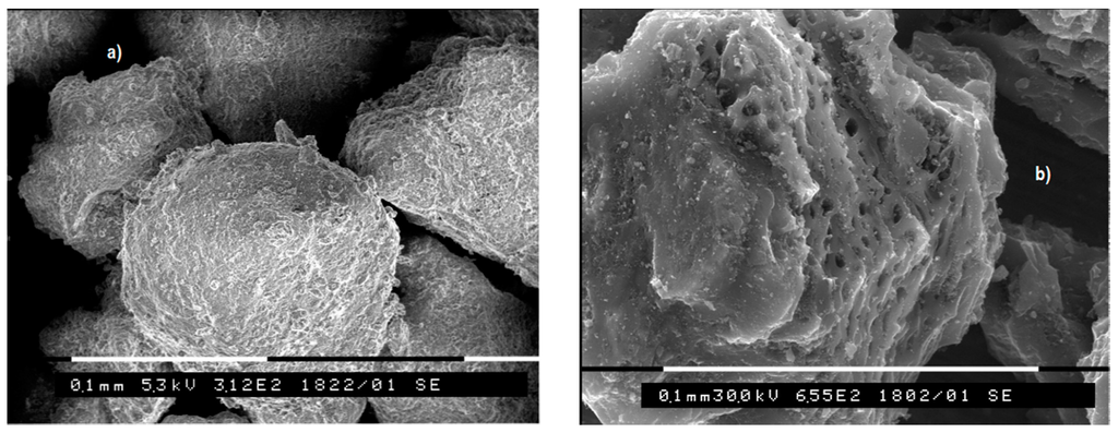 Examples of powder particles with high SSA: fractal-like topography of montmorillonite (a) with SSA ≈ 1000 m2·g−1 (nanometric pores) and activate black coal (b) with surface area around 1100 m2·g−1 and pore size of approximately 5 μm (maximum)—its surface seems to be non-homogenous, i.e., non-fractal. Scale bars 0.1 mm.