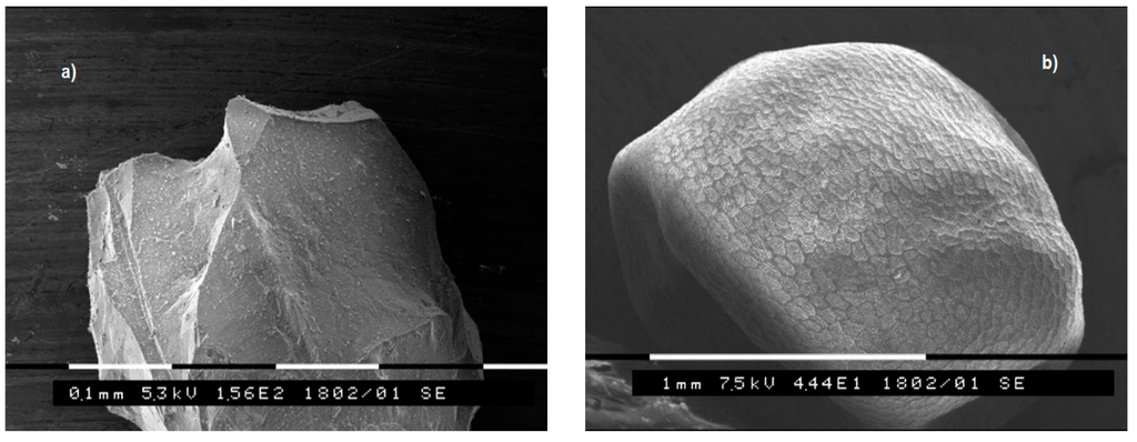 Relatively smooth surface topography of olivine, SSA ≈ 1 m2·g−1 (a) and bio-sample of rapeseed oil having bio-topography (b)—where the surface area was not measured. Scale bars: (a) 0.1 mm, (b) 1 mm.