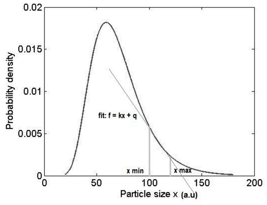 The k and q parameters should be determined based on a linear fit of the experimental distribution in a selected size interval (see Figure 3). The spheric particle with average surface area has a diameter of