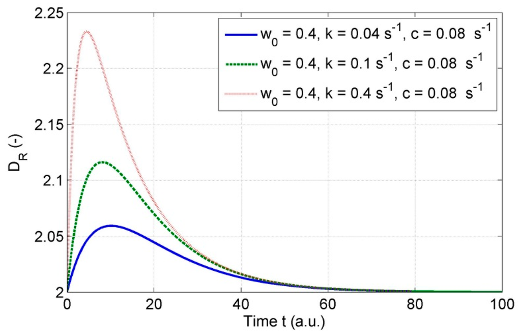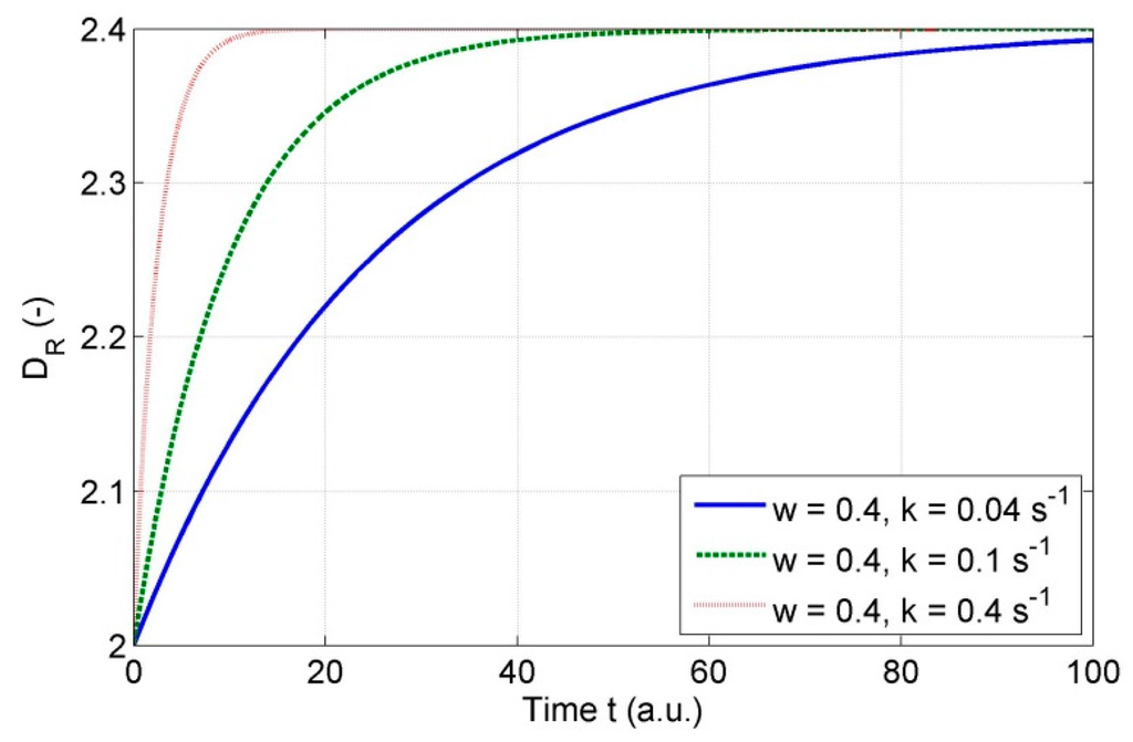 where D = 2 + w, and k > 0 s−1 are constants and t (s) is the time (for simulations see Figure 4). The k constant represents the intensity of adsorbate diffusion to pores. The boundary conditions of the presented equation are DR = 2 at the time t = 0 s and the opposite condition is . More complicated derivations for this process could be made from advanced models of penetration of liquid to fractal porous media [].
