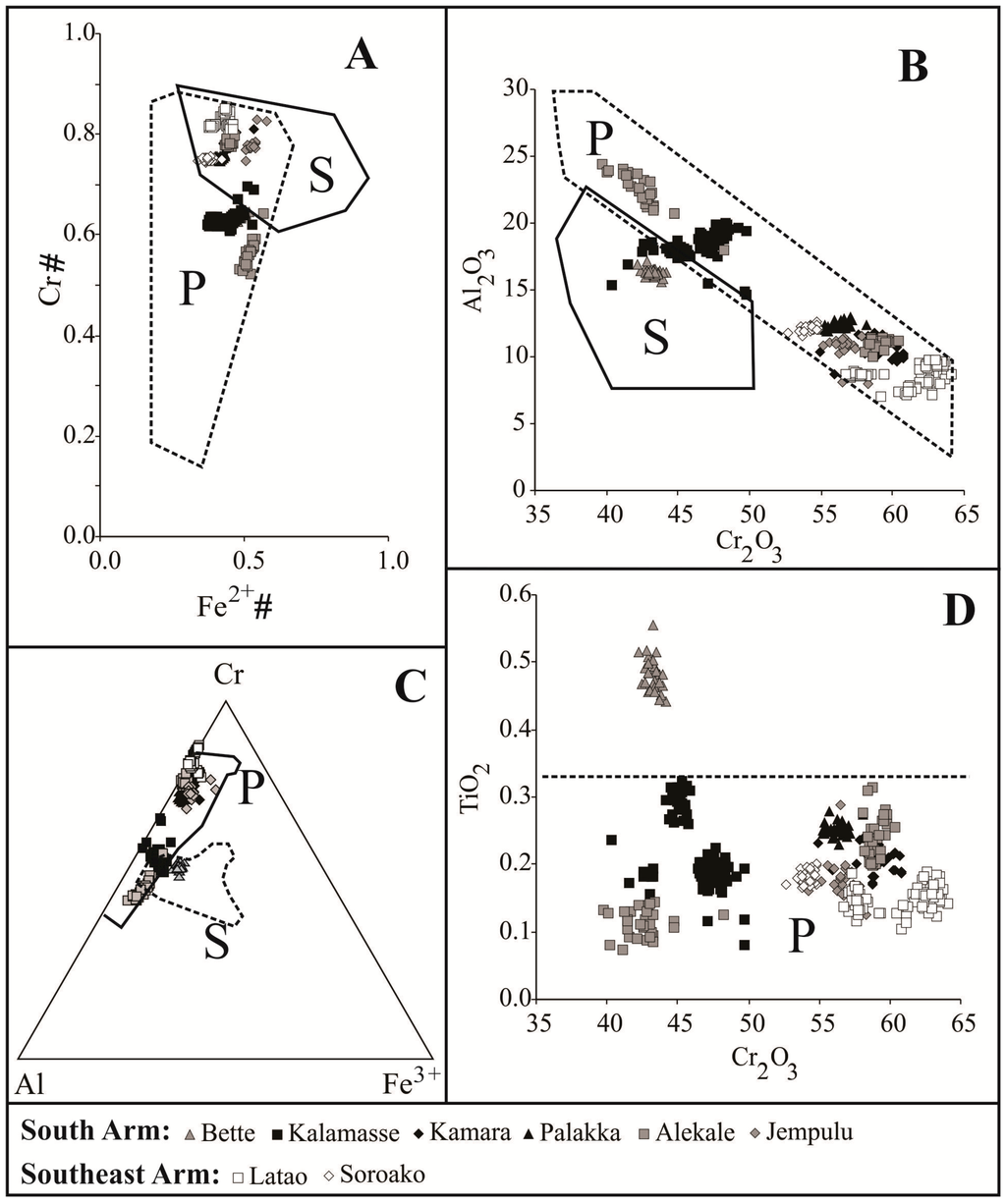 Although the chromite composition of some samples from Alekale and Kalamasse plotted in the field of chromitites formed in the supra-Moho cumulate sequences of the Urals (data from [27]), the composition of the accessory olivine suggests that most of the studied chromitites of Sulawesi are part of an ophiolite mantle sequence. However, as documented by [37], low-Ca content is not unique to mantle olivine. Since the presence of cumulate ultramafics rocks has been reported in the Bantimala Block located the in the South Arm of Sulawesi [34], we cannot exclude the possibility that the Alekale and Kalamasse chromitites formed above the Moho-transition zone.