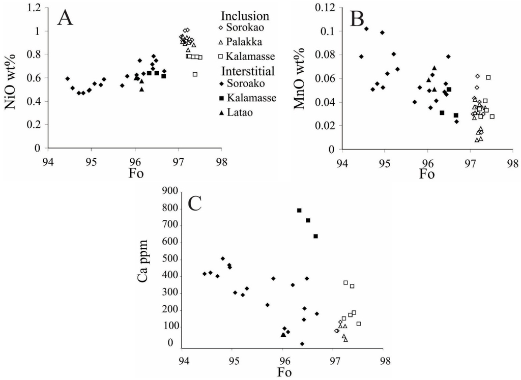Olivine displays a narrow range of the forsterite end member (Figure 6). The Ni, Mn and Ca contents vary significantly between interstitial olivine and olivine included in chromite.