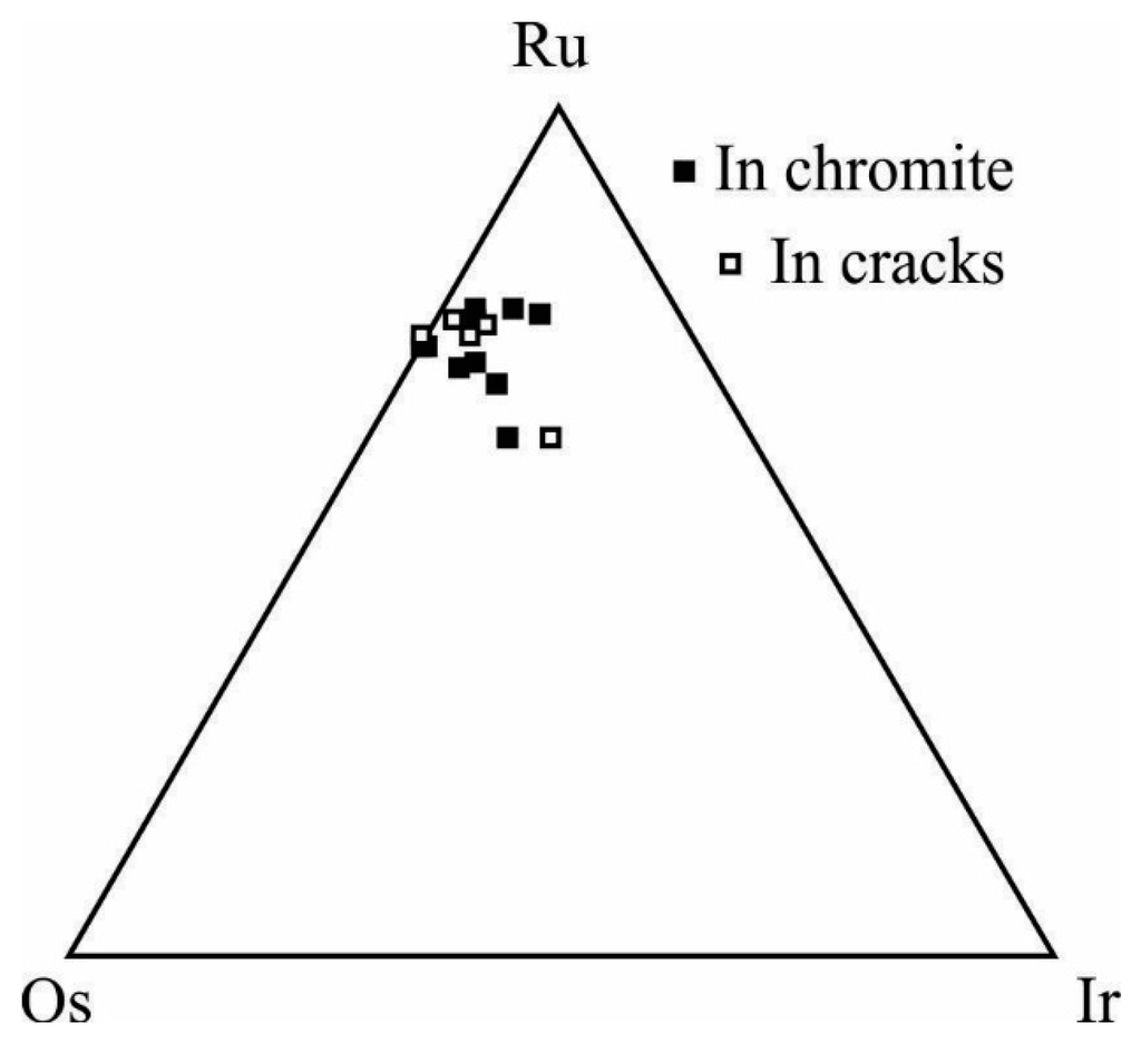 Platinum-group minerals have been found in the chromitites from the South Arm and Southeast Arm of Sulawesi. In particular, PGM have been analyzed in the deposits of Alekale, Kalamasse, Kamara, Palakka and Soroako. The most abundant PGM is laurite (RuS2), accompanied by minor irarsite (IrAsS). The PGM are between 1 and 10 µm. Laurite is euhedral and occurs as inclusions either in fresh chromite (Figure 7A–C) or in contact with fractures (Figure 7D–F). Most of the laurite grains form a single phase (Figure 7A,B,F); however, some occur with a Ni sulfide (Figure 7C), with a Co-rich pentlandite (Figure 7D) and with an apatite (Figure 7E). Small blebs of irarsite were found in (1) a grain composed of awaruite and pentlandite that occurs in the altered silicate matrix (Figure 8A,B) and (2) associated with a Co-rich pentlandite in the ferrian chromite (Figure 8C,D). Selected microprobe analyses of the Sulawesi laurite are listed in Table A4. The laurite contains appreciable amounts of Rh and Pd (2.57 and 2.64 wt %, respectively), and variable amounts of Ni, Fe and Cu are carried in laurite. Arsenic is less variable, and 1.01–2.02 wt % is present. Iridium varies between 0 and 12.68 wt %, and Pt is absent. Grains of irarsite were identified, but could not be quantitatively analyzed because of their small size. Laurite does not show significant compositional variations in relation to its textural position, such as being included in chromite or in contact with fractures, as is typical, for example, of altered laurite [14]. On the contrary, they have similar Ru–Os–Ir relationships regardless of their paragenetic association (Figure 9).