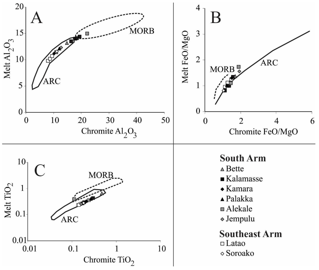 Chromite-melt relationships for (A) Al2O3, (B) FeO/MgO and (C) TiO2, in the chromitites from Sulawesi (modified after [22]).