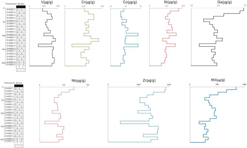 Vertical variations of selected trace elements of the tuff in Zhongliangshan mine, Chongqing.