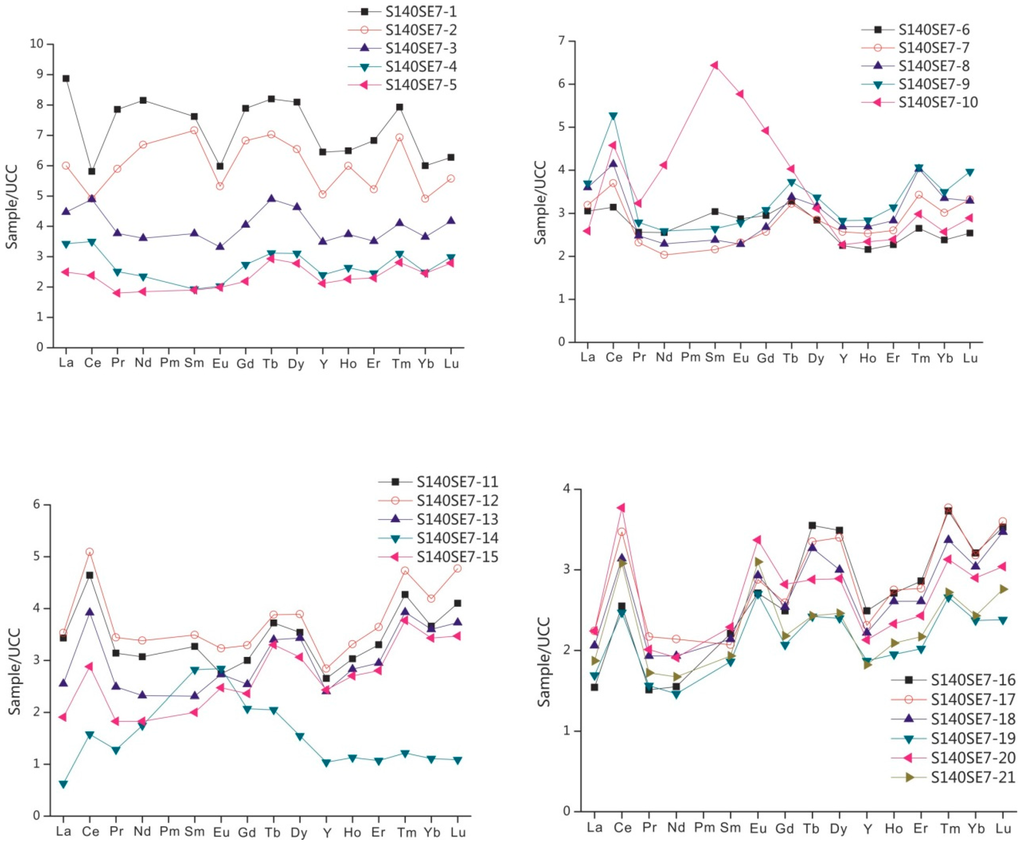 Table 4 and Figure 7 illustrate that the tuff in the Zhongliangshan mine is mainly enriched in heavy REE. Only samples S140SE7-1, S140SE7-3, S140SE7-4, S140SE7-6, and S140SE7-8 are enriched in light REE; and samples S140SE7-2, S140SE7-10, and 140SE7-14 are enriched in medium REE. From top to bottom, the light REE enrichment only occurs in the upper portion of the profile, while the lower portion is enriched in heavy REE and the medium REE enrichment occasionally occurs in the middle portion.
