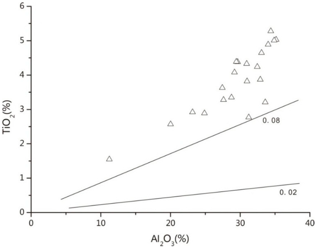 Plot for TiO2 vs. Al2O3 of tuff samples in the Zhongliangshan mine, Chongqing.