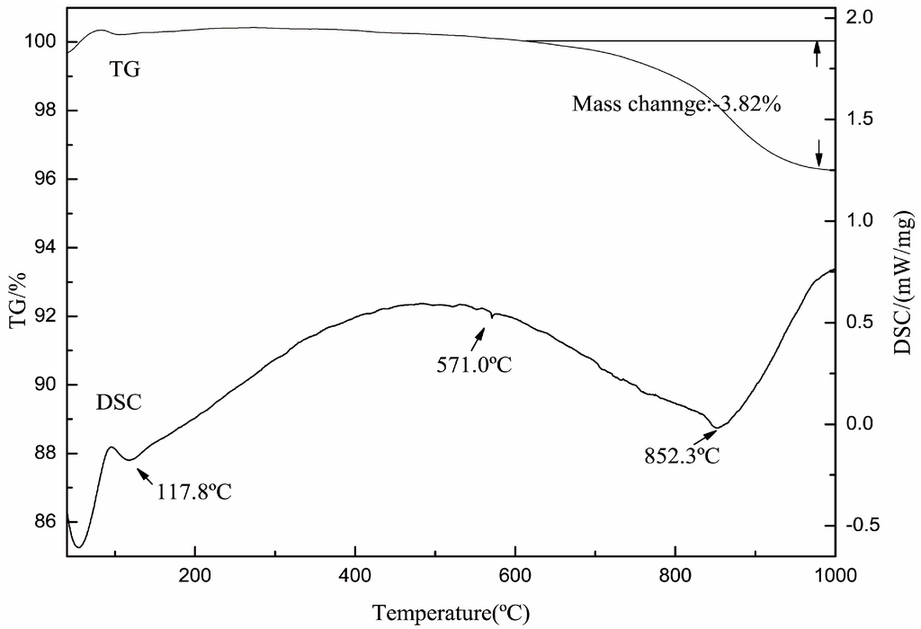 The transformations of crystal structure of muscovite after roasting were carried out by TG-DSC, FTIR, and XRD. Figure 1 shows that the sample weight lost 3.82 wt % from 600 °C up to 1000 °C. The weight of the loss was very close to the expected value (4.5 wt %) of dehydroxylation of mica. This confirmed the initial temperature of dehydroxylation was about 600 °C. In the DSC curve, the peak found at 852.3 °C indicated the dehydroxylation of muscovite was most strong at 852.3 °C.