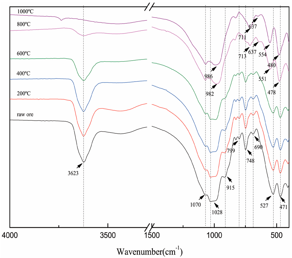 The absorption peaks at 1028, 799 and 748 cm−1 are attributed to Si (Al)–O and Si–O–Si (Al). At 800 °C, the shoulder absorption peak at 1029 cm−1 shifted to about 990 cm−1. At the same time, the weak absorption peak at 799 cm−1 disappeared, and the weak absorption peak at 748 cm−1 appeared to shift to 713 cm−1. These changes are related to the distortions of the (AlO6) octahedron and (SiO4) tetrahedron caused by dehydroxylation in (AlO6) octahedral.
