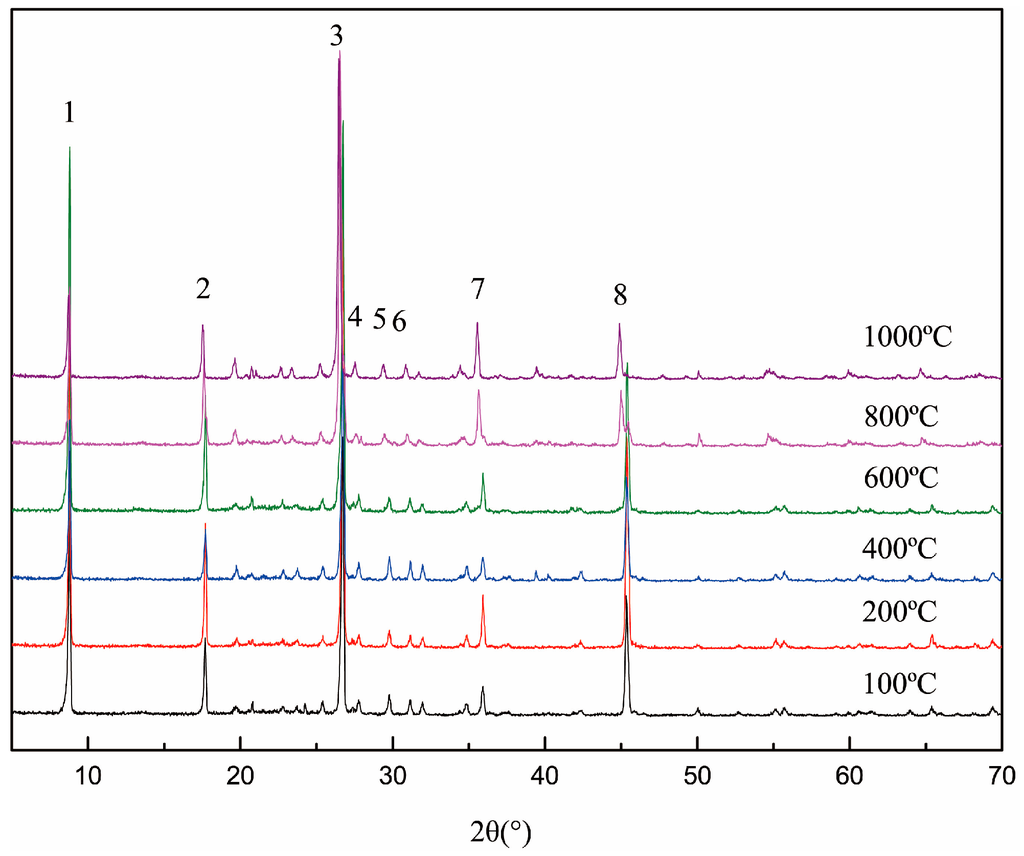 X-ray diffraction (XRD) patterns of roasted muscovite at different temperatures.