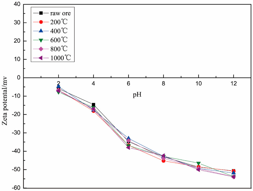 The zeta potentials of roasted muscovite are shown in Figure 4. The zeta potentials of samples with different roasting temperatures saw no obvious changes in the same pH solution, and the zeta potential of all samples was negative in a pH range from 2 to 14 and decreased with the increase in pH, which is consistent with previous research results [,,]. In conclusion, the zeta-potential of muscovite is related to its cleavage plane and its element properties. The layer structure of the muscovite was not destroyed, and the element distribution on the surface also was not changed by the roasting. Therefore, the electric properties of muscovite will not change, nor thus will the electrostatic physical adsorption mechanisms of muscovite and DDA.