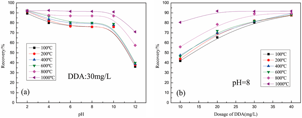 The samples roasted at different temperatures showed different flotability with 30 mg/L DDA (Figure 5a). At pH = 2, the roasted samples had similar flotation recovery (90%). When the roasting temperature was below 600 °C, the samples had a similar flotation phenomenon, with a pH range from 4 to 14, and the flotation recovery of the sample increased with the increase in roasting temperature when it was over 600 °C in the same pH. As shown in Figure 5b, the recoveries of all samples are close to 90% with the increase in dosage of DDA, but the samples with different roasting temperatures needed different dosages of DDA. The sample roasted at 1000 °C only needed 20 mg/L DDA to make the recovery reach 90%, but the sample roasted at 800 °C needed about 30 mg/L DDA, and other samples need about 40 mg/L DDA.