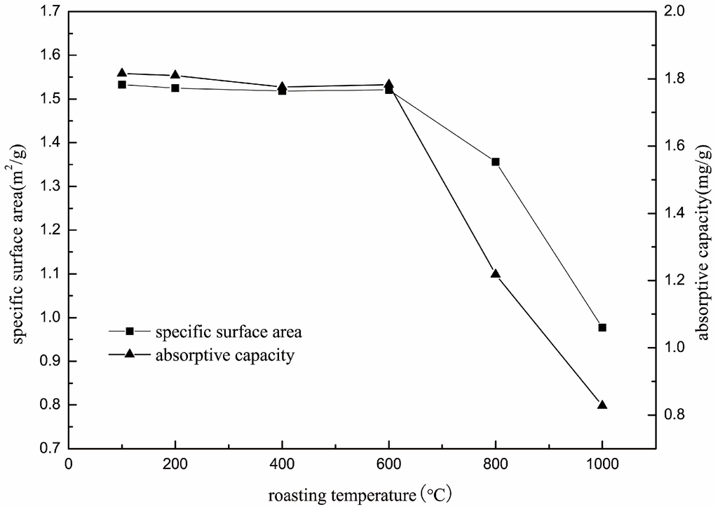 The surface area and DDA adsorption capacity of roasted muscovite samples were tested, and the results are shown in Figure 6. The specific surface was stable at about 1.5 m2/g when the roasting temperature was below 600 °C, and the specific surface of roasted muscovite decreased when the roasting temperature was over 600 °C. At 800 °C, the specific surface was 1.35 m2/g, and, at 1000 °C, the specific surface dropped to 0.97 m2/g. The DDA adsorption capacity of muscovite was stable at about 1.80 mg/g when roasting temperature was below 600 °C. The DDA adsorption capacity of muscovite roasted at 800 °C decreased from 1.80 to 1.22 mg/g, and the DDA adsorption capacity of muscovite roasted at 1000 °C dropped to 0.82 mg/g. The downward trends of specific surfaces are consistent with the adsorption capacity, indicating that the decrease in specific surface area was the main reason for the decrease in adsorption capacity.