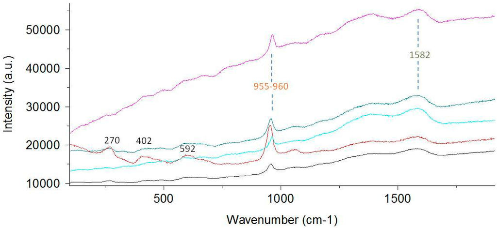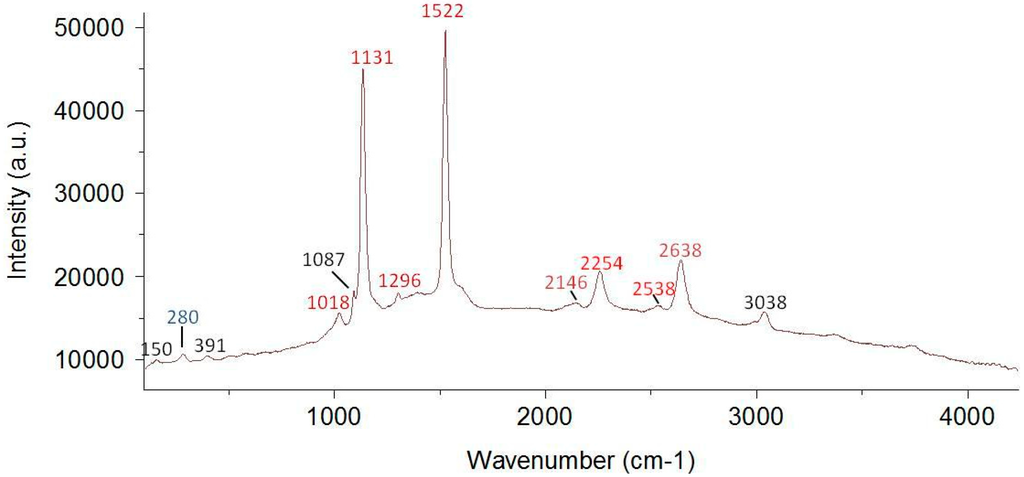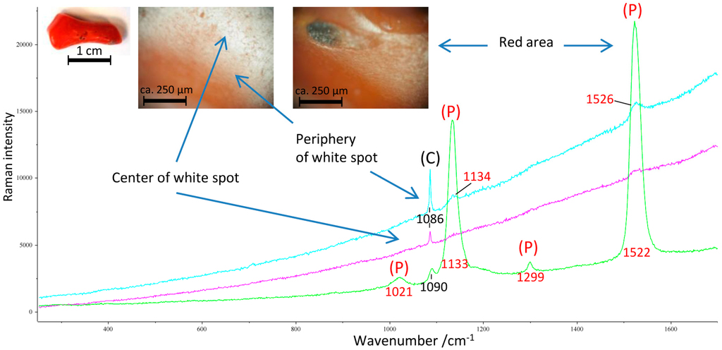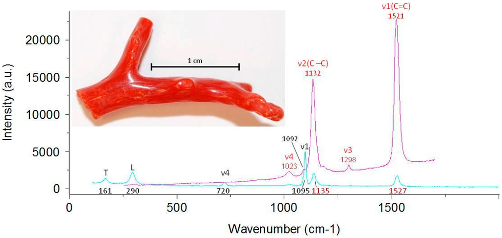 Raman spectroscopy allows detecting both the mineral part and the organic pigments of red coral. Resonance or near-resonance Raman scattering is exceptionally sensitive to both pigment groups, the carotenoids and polyenes, even in very low concentrations [27]. Numerous studies on red corals or red colored marine shells were carried out using Raman spectroscopy [8,11,18,20,21,22,23,24,25,26,27,28]. Kupka et al. [26] state that a very small amount of organic matter is able to change the color of this coral from white to pink, leading to the conclusion that the Raman activity of such ‘chromophores’ is very high.