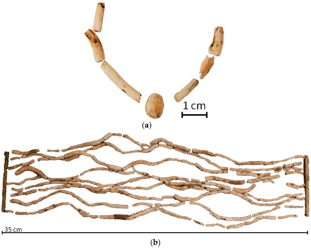 Examples of almost unprocessed corals from the Iron Age (~620–450 BC) in southwestern Germany. (a) Necklace from Tomb 122 of the Magdalenenberg tumulus near Villingen-Schwenningen (Schwarzwald-Baar-Kreis). A detail is shown in Figure 3e. (b) Pectoral necklace from a tumulus near Allensbach-Kaltbrunn (Landkreis Konstanz). (c) Piece of oddly circular-shaped coral branch from Burial 6 of the Hohmichele tumulus near Altheim-Heiligkreuztal. (d) Necklace of single coral pieces and egg-sized bulbs, composed of several lamellae from the burial of a young woman at Esslingen-Sirnau.