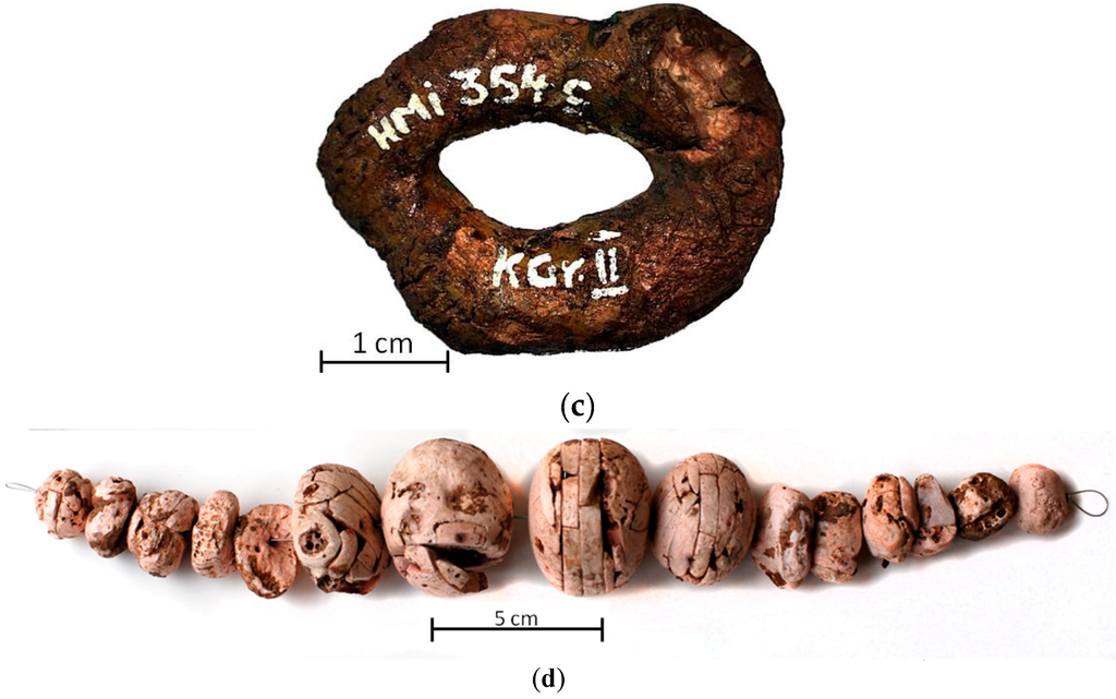 - Weiß, M.; von Zelewski, B. Untersuchungen zu einigen Ziereinlagen. In Waldalgesheim. Das Grab Einer Keltischen Fürstin; Joachim, H.-E., Ed.; Rheinland-Verlag GmbH: Bonn, Germany, 1995; pp. 148–158. (In German) [Google Scholar]