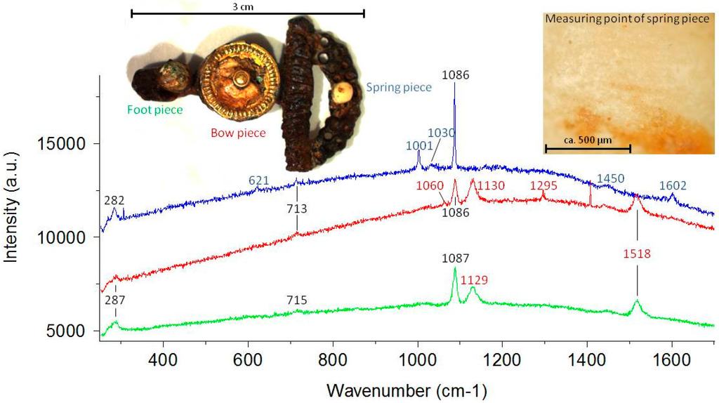 The analyses of the three light colored pieces of a small fibula (Figure 5) from a rich female grave of the second half of the fifth century BC from Schwieberdingen “Wartbiegel” in northern Baden-Württemberg in Germany yielded interesting results concerning the usage of different materials on one artifact, the connections to long distance trade objects and the social structures at that time. Nowadays, the preservation conditions and colors of the three pieces on this very small (only 3 cm long) iron fibula differ from each other. The small bead at the reversed foot of the fibula is almost completely covered by layers of brown corrosion material and has an irregularly-formed surface. The largest piece on the bow at the center of the fibula is placed on a thin gold foil and is fixed by a small golden rivet. Although this cabochon is partially broken and the surface is also irregular, it still has pinkish and orange hues. The small bead on the spring in the front of the fibula has a light and intact surface texture, but with a few small brown spots of corrosion products. The spectra of the pieces from the foot and bow show features of calcite with a (CO3)2− main band at 1086 cm−1 and two minor bands at 282 and 713 cm−1. The wavenumber position is only slightly higher than that of biogenic calcite and is in the lower region of the expected value for HMC as incorporated in modern C. rubrum (see Figure 1; [18,50,51]). The characteristic ν1 and ν2 bands, representing the unmethylated polyenic pigments at 1518 and 1130 cm−1, of the still orange colored bead from the bow are very intense and as high as the (CO3)2− band, even with a 632.8-nm excitation. Two more pigment bands at 1020 and 1294 cm−1 are visible. The combination of a broad calcite band together with intense pigment peaks offers a high probability of C. rubrum.