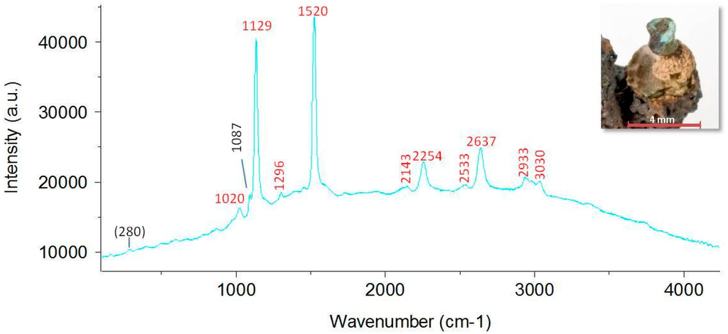 Of the original seven decorative elements of the iron fibula, the remaining three have been investigated by Raman spectroscopy. The bead on the foot (Figure 6) already showed typical optical signs of C. rubrum, which could be confirmed by the Raman spectrum. The bands labeled in red in Figure 6 also indicate that this pearl had originally been red.