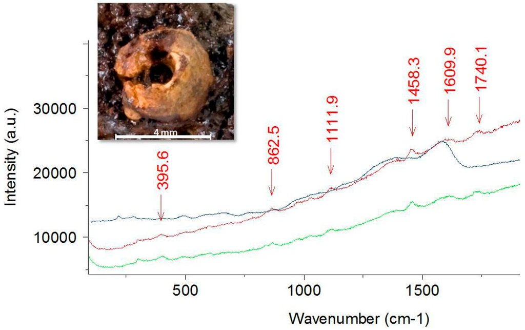 Today, the bead on the spring of the fibula has a reddish-brown color. The material used (Figure 7) could not be identified yet, since the obtained spectrum neither corresponds to calcium carbonates, like corals and mollusks, nor to any kind of apatite-containing material, like bone or ivory. The presence of amorphous carbon in the region 1580–1600 cm−1 with a smaller band at about 1458 cm−1 indicates a contamination or residues of organic material. This piece expands the range of materials and shades employed in Iron Age jewelry, since it can be assumed that the original hue came close to the current one and that it looked neither like ivory nor like coral.