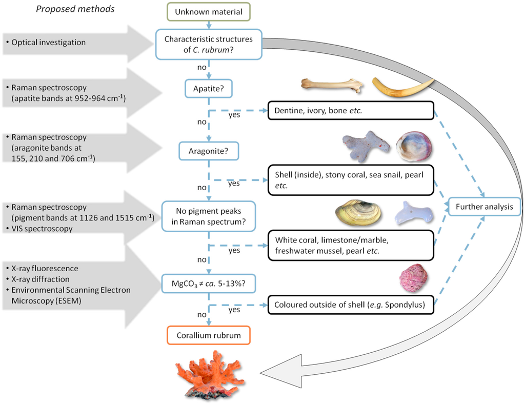 Methodologically, these previous findings on the structure and color of archaeological and recent C. rubrum artifacts and other biominerals (see [54]) can be joined together in the form of a non-destructive multi-stage approach to identify red corals and light colored biominerals with emphasis on optical examination, digital microscopy and Raman spectroscopy with a laboratory instrument or a portable one.